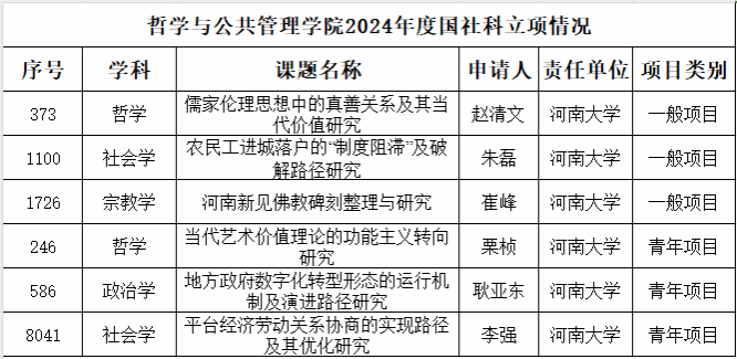 共有6位教师申报的课题成功获批立项,其中年度一般项目3项,青年项目3项,青年项目获批数量再创新高,展现了学院在相关学科领域的雄厚的储备实力。此次获批项目涵盖儒学、佛学、分析美学、地方社会治理、社会政策等多个学术领域,紧密结合当代社会的热点与前沿问题。这不仅体现了学院教师在基础研究和应用研究中的深厚积淀,也是学院紧紧围绕国家和社会发展战略需求开展有组织科学研究的努力成果。本次具体获批情况如下: