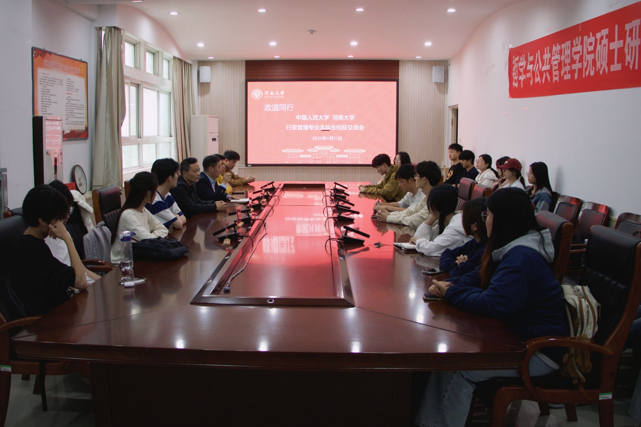 23级行政管理2班全体学生与中国人民大学22级行政管理专业3名学生围绕专业学习、学科竞赛,科研素养积累等议题展开深入交流,行政管理系主任吴岚波老师,社会工作系毛立红老师参加交流会,会议由吴岚波主持。