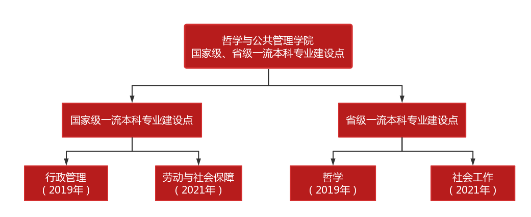 行政管理专业(2019年)、劳动与社会保障专业(2021年)入选国家级一流本科专业建设点,哲学(2019年)、社会工作(2021年)专业入选省级一流本科专业建设点,四个本科专业全部为国家级/省级一流本科专业建设点。