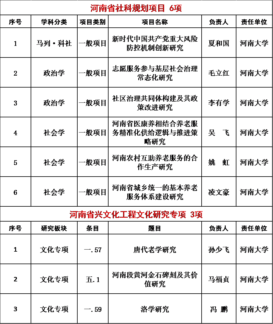 教师凌文豪、夏和国、毛立红、李有学、吴飞、姚虹申报的2022年度河南省哲学社会科学规划项目获批立项;马福贞、冯鹏、孙少飞申报的河南兴文化工程文化研究专项项目获批立项。