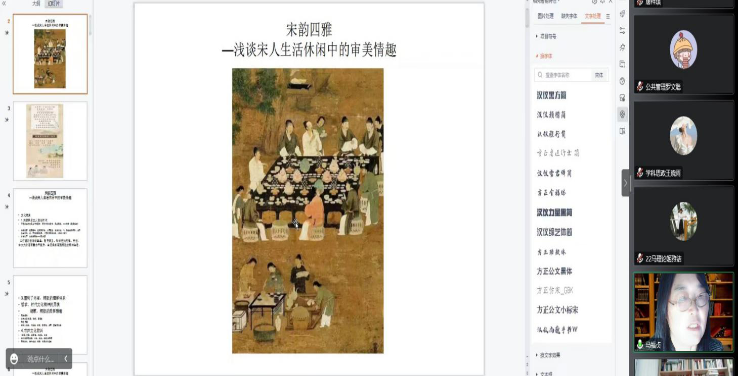 马福贞副教授在线作了题为《宋韵四雅——浅谈宋人生活休闲中的审美情趣》的报告,讲座由杨红玉副教授主持,中文在线