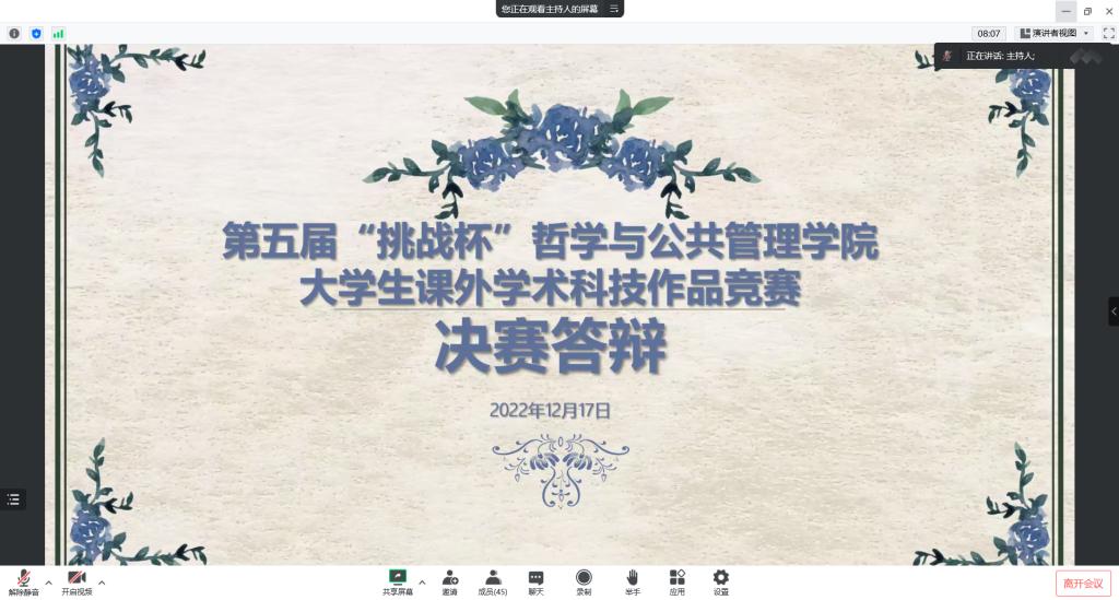 大学生课外学术科技作品竞赛答辩于线上举行。行政管理系教授刘辉、劳动与社会保障副教授李晓玉、社会工作系副教授付光伟担任本次答辩评委,15支入围决赛团队参加答辩。