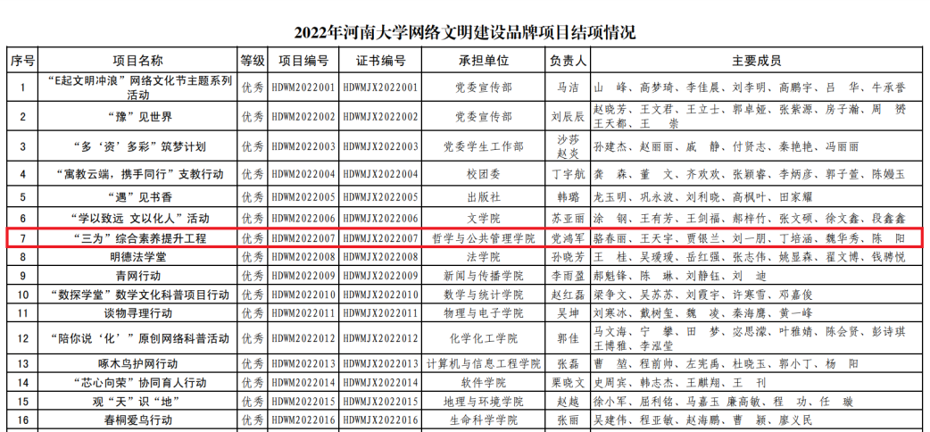 网络文明建设品牌项目优秀组织单位。学院党委书记党鸿军负责的《“三为”综合素养提升工程》项目被评为2022年中文在线