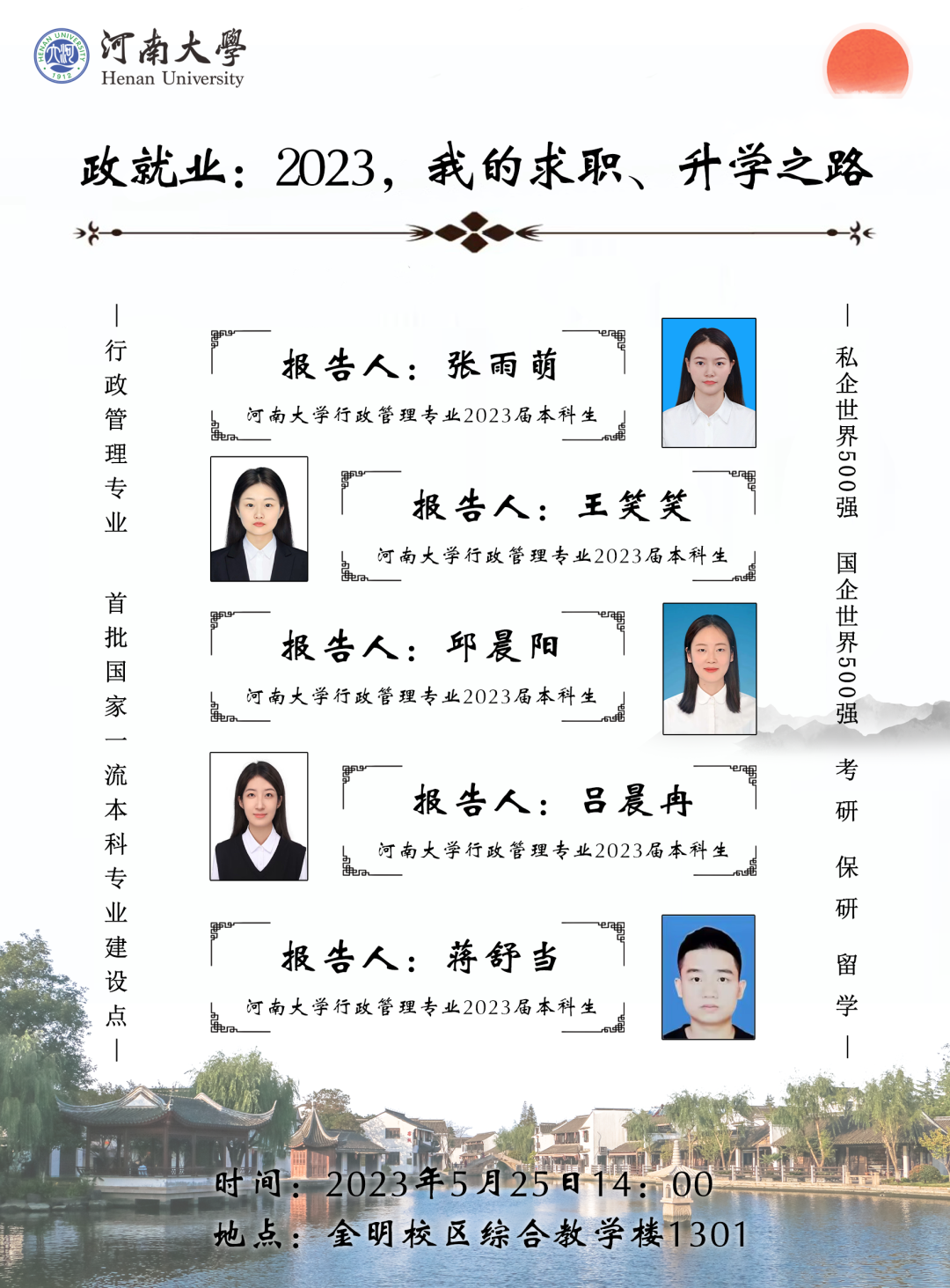 行政管理系于综合楼1301举办“政就业:2023,我的求职、升学之路”经验交流会,公共管理类本科生参加,2023届五位本科毕业生受邀分享,会议由行政管理系主任刘辉主持。