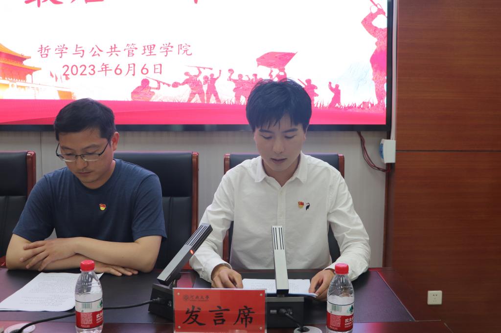 回顾入党经历,感恩党的培养。2019级毕业生党员代表李源以党的理论学习者、传播者和践行者三个角色切入,分享了入党以来的历程与感悟,向学院党委的培养与呵护表示感谢。作为学习者,他以组织委员身份领学理论,依托青马平台学习党的精神;作为传播者,他参与博雅志愿服务宣讲团面向多省宣传党的理论;作为践行者,他将前往祖国西部敦煌开展支教,用行动在西部大地书写河大“自强不息,百折不挠”的精神气概。他号召各位毕业生党员以优秀党员标准严格要求自己,坚定理想信念,敢打敢拼创事业,不负老师、学院、学校培养。