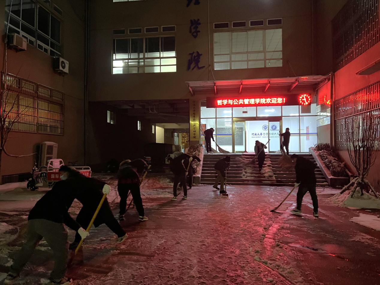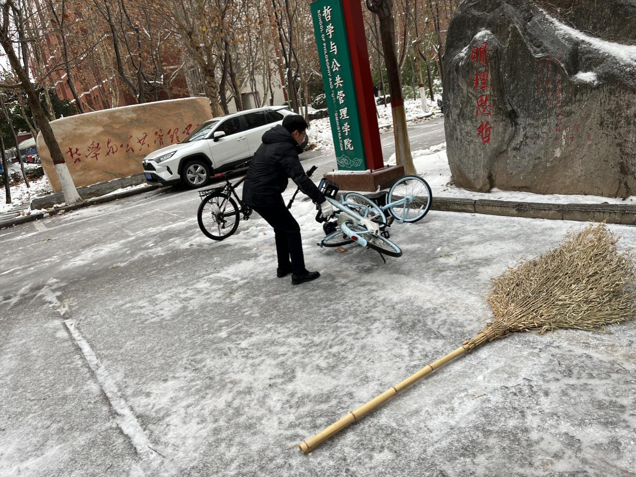 2023年冬雪初至,连续几日降雪为河大校园带来了一场银装素裹的美景,同时也造成了道路积雪、路面结冰等安全隐患。为保障广大师生的出行安全,尽快恢复正常的教学秩序,近日,在学院工会主席王晓东的带领下,中文在线