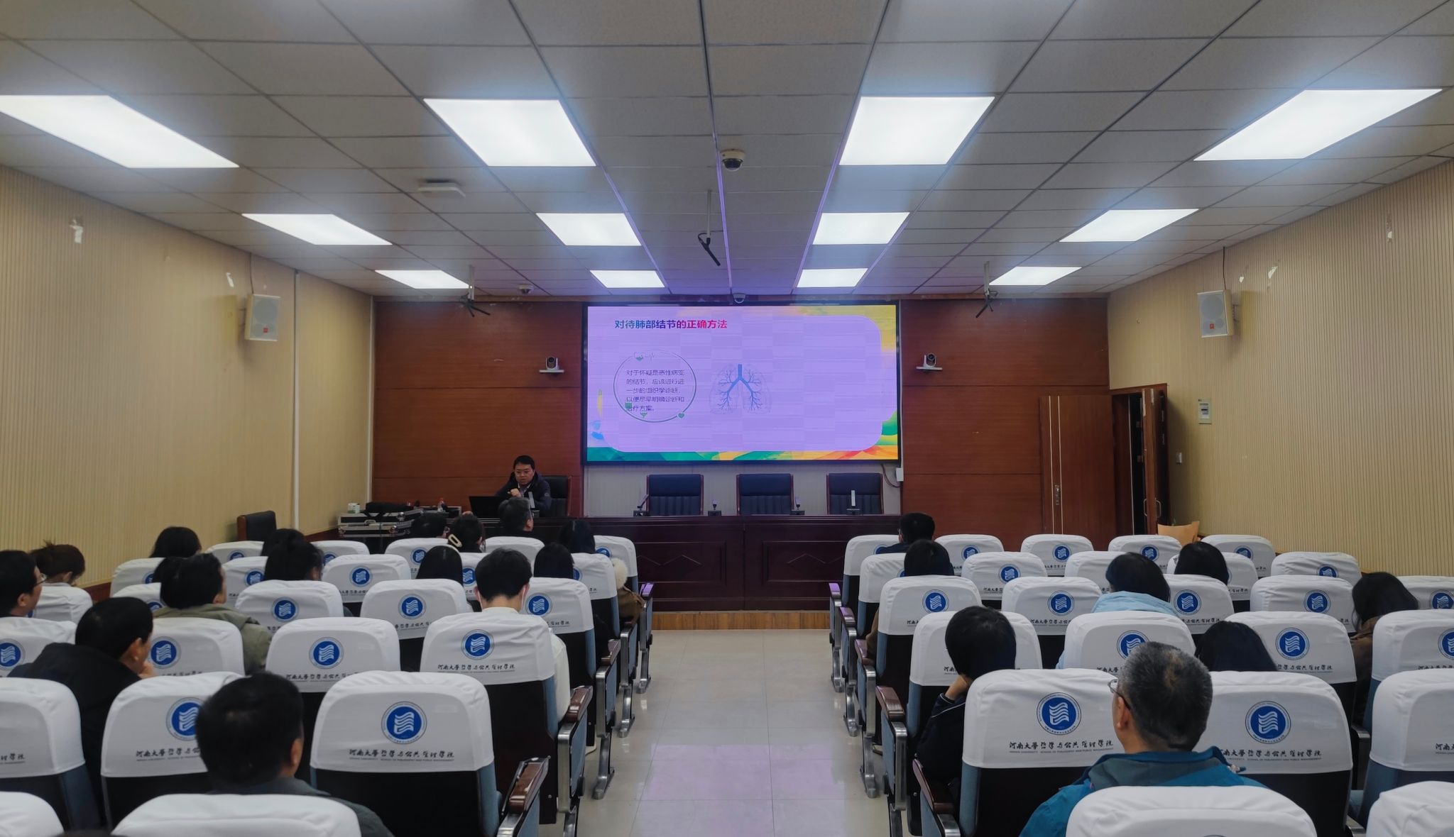 本次讲座邀请了三位专家进行主题演讲。开封市中心医院乳腺甲状腺外科副主任医师焦东晓从“呵护乳腺,绽放美丽”方面深度解读乳腺健康的重要性,介绍乳腺保健知识,引导教职工正确对待乳腺健康问题。妇产科副主任医师陈晨从实际案例出发,深入浅出地讲解“绝经期管理整体观”,并提出科学全面的管理观念,帮助女性科学、合理保持身心健康。呼吸与危重症医学科主治医师杜德森以肺部健康为主题,通俗易懂地介绍了肺结节的相关知识,呼吁大家对肺病风险时刻关注,及时发现,迅速处理。