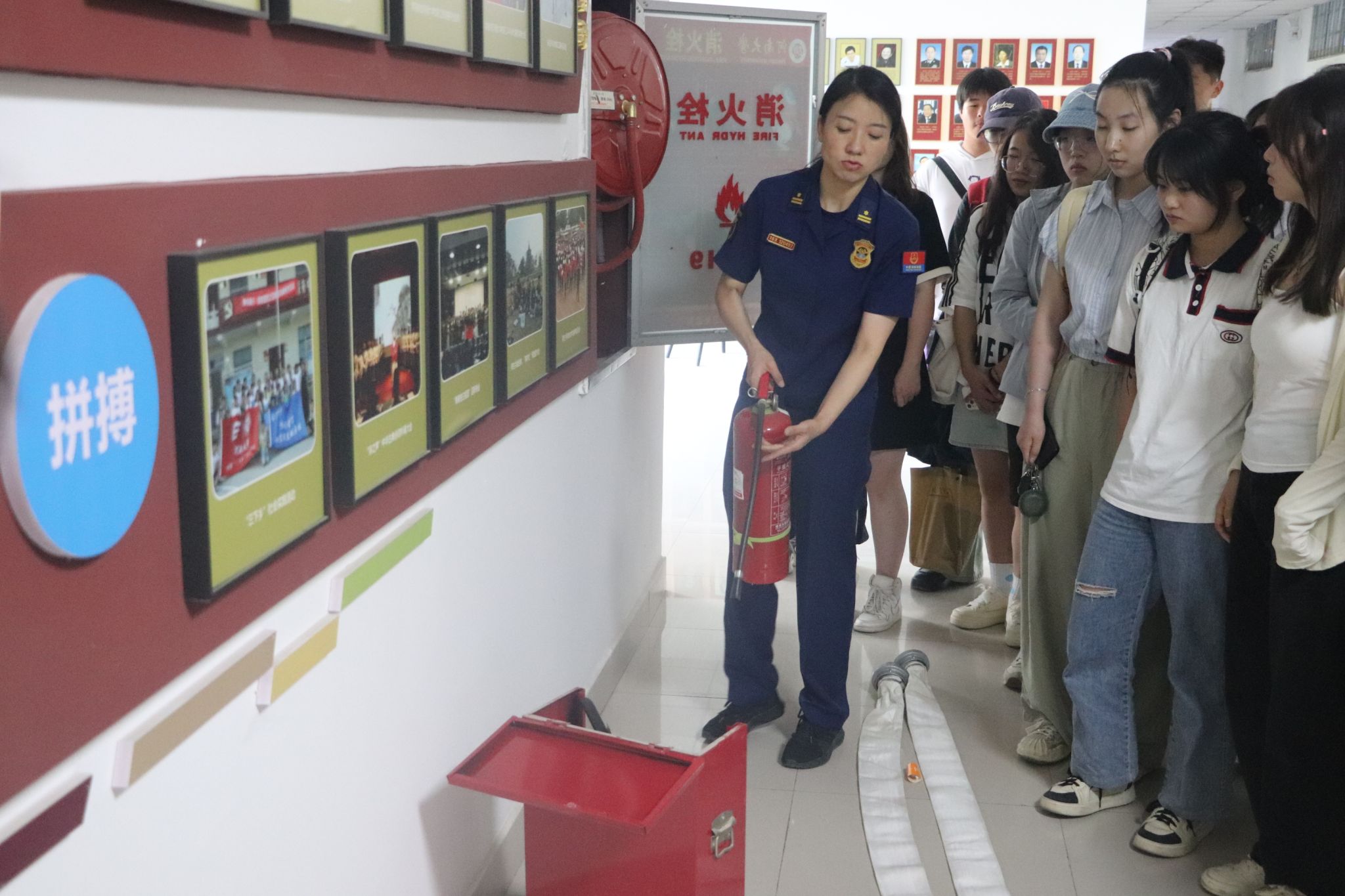 还组织了参会师生进行消防安全和灭火器材的规范使用演练。王芳为大家详细讲解了不同种类灭火器适用的火灾情况及使用方法,演示了消火栓与水带、水枪头的连接及出水灭火等具体操作步骤。与会师生分组上阵、逐一体验,全过程演练与灭火实际操作,掌握了正确使用灭火器材的方法和技术要领。